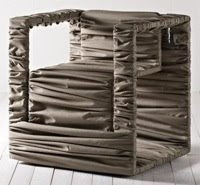 The fabric, while durable for all sorts of weather, must be exceedingly difficult to remove and clean. One could argue one has 'people' for that sort of thing, and certainly those who can afford designer furniture 'ought not' take that into account, but I think it's a pretty poor showing as a design for being both impractical and ugly. Even if the fabric generates volume and comfort, the clothed-paperclip look of the thing makes me wonder why they made a concession to back support at all. There's so little for the lumbar there that they'd have been better off with a cloth box.